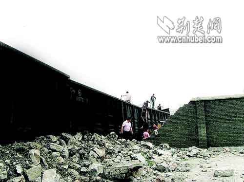 昨日(5月31日)清晨6時(shí)許,荊門石化軍馬場(chǎng)貨場(chǎng)里,工人在連接列車車廂時(shí)剎車失控,9節(jié)滿載煤炭的車廂脫軌撞垮貨場(chǎng)圍墻,橫在圍墻外的軍馬場(chǎng)路上。所幸該處比較偏僻,事發(fā)時(shí)路上人車稀少,未造成人員傷亡。
