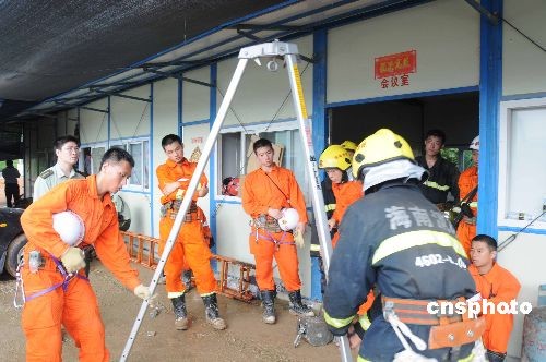 6月4日23時許發(fā)生的三亞繞城高速公路迎賓隧道塌方事故救援工作6日繼續(xù)進行。截止6日上午9點半,8名被困施工人員尚無人員救出。三亞市交通局副局長崔海龍上午介紹說,在原有救援方案繼續(xù)進行的同時,目前新增了兩套救援方案。一是從隧道上方新增一處選址鉆孔到隧道內(nèi),安插一個管道,為被困人員送水、送風、送食物、喊話“送信心”。目前這一方案正在進行中,但進度較慢。二是從塌方處由外向里挖“貓洞”作為救生通道,用鋼板制作一個三角形的通道,能容納一個人進出,通向被困人員。圖為三亞消防官兵在調(diào)試救援設備。中新社發(fā) 胡劍兵 攝