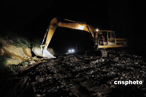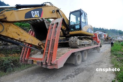 6月7日,大型救援設(shè)備駛?cè)胫貞c武隆山體垮塌現(xiàn)場(chǎng)。從6月6日17點(diǎn)開(kāi)始,重慶市交委從渝湘高速公路建設(shè)工地調(diào)集了150余名技術(shù)骨干和20臺(tái)挖掘機(jī)、裝載機(jī)、壓路機(jī)、大型貨車,抽調(diào)武隆交通部門和沿線市民150余人及25臺(tái)大型機(jī)械設(shè)備對(duì)通往鐵礦鄉(xiāng)的28公里救援通道進(jìn)行搶修。中新社發(fā) 劉確樹(shù) 攝