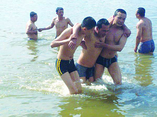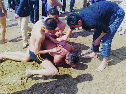 上岸之后,人們手忙腳亂地要學(xué)電視里的樣子給昏迷過去的韓德強擠壓心肺,小伙子再一次表現(xiàn)出來非凡的冷靜:“不能讓他仰臥!否則鼻腔里的水可能進入腦部!毙』镒影牍蛟诎哆叞秧n德強俯臥著放在自己腿上,拍打他的后背將水控了出來,絲毫沒在意自己的膝蓋已經(jīng)被尖銳的沙石擦傷,流出了鮮血。