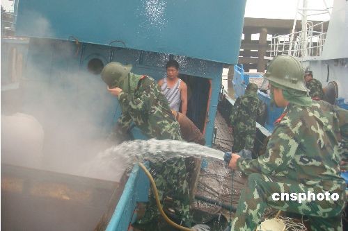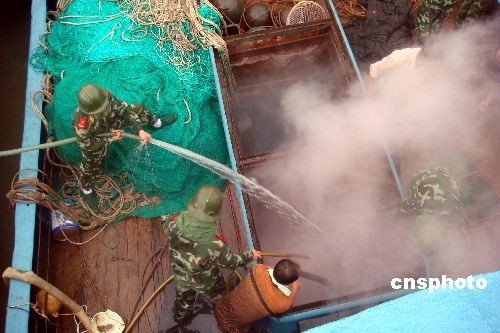 6月10日傍晚5時許,浙江省溫州市鹿西島一艘停泊在港內(nèi)休漁的鋼質(zhì)漁輪因電線老化引發(fā)大火,火勢迅速從中艙向外蔓延,隨時可能危及到?吭谝黄鸬20多艘漁船。發(fā)現(xiàn)險情后,鹿西邊防派出所官兵迅速攜帶滅火裝備趕赴火災(zāi)現(xiàn)場救援,附近漁民也紛紛加入滅火隊伍。經(jīng)過一個多小時的奮力撲救,大火最終被完全撲滅,所幸未造成人員傷亡。中新社發(fā) 吳水斌 攝
