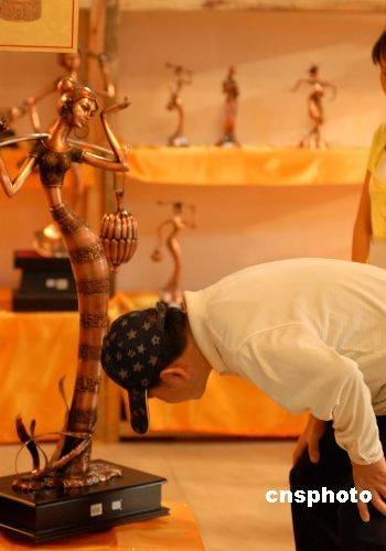 云南民族民間工藝品交易市場6月10日在昆明開業(yè),該市場占地10000平方米,是中國少有的民族民間工藝品專業(yè)交易場所。云南省將借助該市場推出木雕、青銅器、錫器等具有競爭力的民族民間工藝品,做大民族文化產(chǎn)業(yè)。開業(yè)僅兩天,該市場已成為云南各大旅行社帶團(tuán)參觀的必經(jīng)之地。圖為6月13日,一名游客被一尊名為汲水歸來的銅像吸引,該銅像獨(dú)具傣家風(fēng)情,叫價(jià)近萬元。中新社發(fā) 保旭 攝
