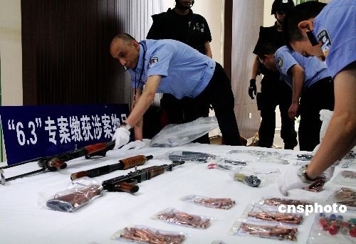 6月15日,重慶市公安局向媒體通報(bào),當(dāng)月3日發(fā)生在重慶主城區(qū)的槍擊案已告破。警方抓獲直接參與持槍殺人的3名罪犯,還通過(guò)偵破此案發(fā)現(xiàn)和擴(kuò)大線索,一舉抓獲50多名涉槍、涉黑和涉惡等犯罪的嫌疑人,繳獲兩支56沖鋒槍、一支唧筒式獵槍、一支德國(guó)造PP手槍、一支仿制手槍和一枚手雷、一副手銬及439發(fā)各類子彈。圖為重慶警方在整理繳獲的涉案物品。中新社發(fā) 郭虹 攝