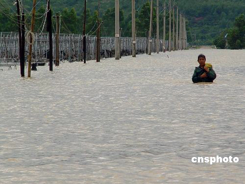 受熱帶風暴“蓮花”影響,福建省詔安梅洲鄉(xiāng)下起特大暴雨。據(jù)該縣氣象局測報, 從6月22日凌晨0點至早上8點,8小時降雨量達到273毫米。這場暴雨使梅洲鄉(xiāng)遭受罕見水災(zāi),1580多戶民眾家中進水,最高進水位達3米多高,上萬民眾受災(zāi),近兩千名民眾安全轉(zhuǎn)移。22日中午,雨水停后,水位已開始快速回落。中新社發(fā) 沈麗煌 攝
