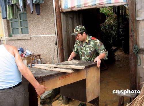 6月25日,福建霞浦鹽田邊防派出所官兵在轄區(qū)釣岐村村民謝玉海家進(jìn)行救助。受臺(tái)風(fēng)“蓮花”影響,福建寧德陰雨不斷,霞浦鹽田部分地帶出現(xiàn)山體滑坡、泥石流現(xiàn)象,靠山居住的村民出現(xiàn)危機(jī)。獲悉情況后,當(dāng)?shù)剡叿拦俦鴮?duì)居住危險(xiǎn)地帶的50余戶群眾進(jìn)行了迅速轉(zhuǎn)移,并幫助受災(zāi)戶進(jìn)行積極救助。中新社發(fā) 王力鵬 攝