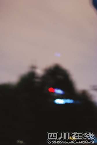 昨(7月2日)晚8點30分左右,成都磨子巷上空出現不明飛行物,附近上千市民從家中跑出,到陽臺或街上觀望:夜幕中有一藍色光團如圓月大小,靜靜觀看時,可發(fā)現該光團藍紅光交替,向西南方向緩慢移動(如圖)。該現象持續(xù)至9點50左右結束,成都市飛碟協(xié)會秘書長楊佛章初步猜測,是涂有發(fā)光材料的風箏等物品造成的。