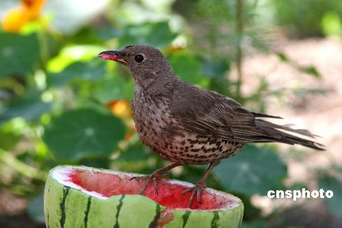 7月4日,新疆哈密一只鳥(niǎo)兒啄食西瓜。剛剛進(jìn)入7月,位于新疆東部的吐哈盆地連日來(lái)氣溫逐日升高,未來(lái)兩天內(nèi)預(yù)計(jì)最高氣溫達(dá)37-39度,7、8月份是當(dāng)?shù)匾荒曛凶顭岬募竟?jié),哈密地區(qū)極端最高氣溫達(dá)43度,吐魯番地區(qū)極端最高氣溫達(dá)48度。中新社發(fā) 張建剛 攝