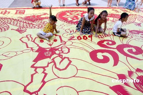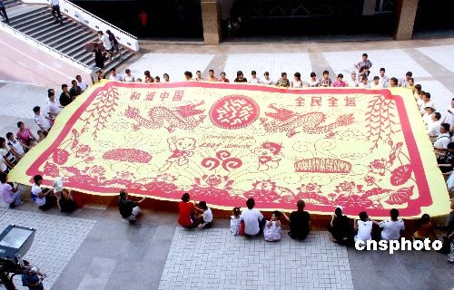 2009年7月5日,濟南剪紙藝術院的工作人員和市民在濟南市泉城廣場展示巨幅剪紙作品。當天是第十一屆全運會倒計時100天,濟南剪紙藝術院的120多名藝人耗時6個月,共同創(chuàng)作完成巨幅剪紙作品。據(jù)了解,該作品總面積61.6平方米,長11米(寓意第十一屆全運會),寬5.6米(寓意56個民族),主題為和諧中國、全民全運。作品中的圖案包含十一全運會標志、吉祥物泰山童子、荷花(濟南市花)、泉水等。中新社發(fā) 龔輝 攝