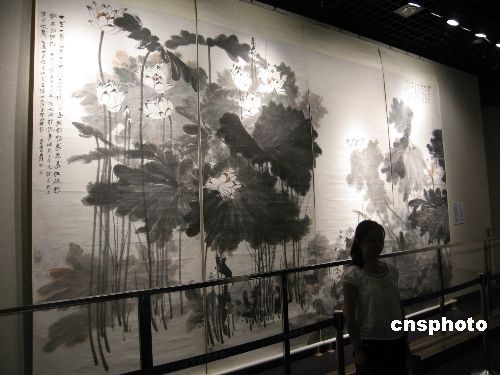 7月3日至8月3日,由遼寧省博物館、臺(tái)北歷史博物館、中華海峽兩岸文化資產(chǎn)交流促進(jìn)會(huì)共同主辦的《南張北溥——臺(tái)北歷史博物館藏張大千、溥心畬書(shū)畫(huà)作品展》,在遼寧省博物館舉辦。展品中張大千的《大墨荷通屏》畫(huà)長(zhǎng)6米、高3.58米,可稱得上是巨作,很多參觀者被其所吸引。圖為7月7日,人們紛紛在畫(huà)作前拍照留念。中新社發(fā) 沈殿成 攝