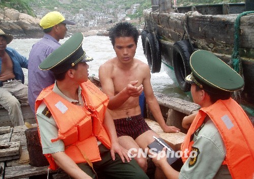 7月18日,受今年第6號臺風(fēng)“莫拉菲”外圍影響,浙江省溫州市南麂島海域風(fēng)浪大增,一艘船號為“浙平30057”的漁船被風(fēng)浪掀翻,船上3名漁民全部落水。接警后,南麂邊防派出所立即啟動(dòng)海上應(yīng)急救助預(yù)案,迅速組織船舶趕赴事發(fā)海域展開搜救,成功將一名抱著木板逃生的漁民營救上岸,另2名漁民失蹤。目前,搜救工作仍在緊張進(jìn)行中。圖為南麂邊防派出所官兵向獲救漁民了解沉船情況。中新社發(fā) 吳水斌 攝