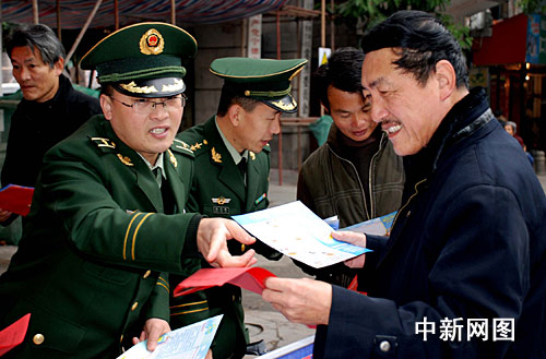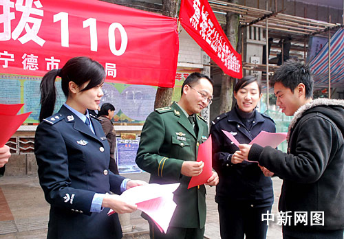 1月10日,在福建寧德市八一五中路,邊防民警向市民發(fā)放宣傳單,介紹邊防110建設(shè)的相關(guān)情況。當(dāng)日,福建寧德市公安局組織開(kāi)展“危難見(jiàn)真情 請(qǐng)撥110”為主題的大型愛(ài)民實(shí)踐宣傳活動(dòng),讓市民了解110、支持110,有效推進(jìn)構(gòu)建和諧警民關(guān)系的進(jìn)程。