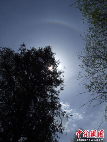 中新網(wǎng)5月23日電 (高峰毅 焦瑾琦) 近日,華北地區(qū)氣溫居高不下。5月21日晚9時許,山西五臺山出現(xiàn)了月暈現(xiàn)象,持續(xù)了近一個小時。而第二天,即22日上午9時許,五臺山上空又出現(xiàn)了日暈奇觀,,并持續(xù)了兩個多小時。這兩種暈的出現(xiàn)時間差不足12小時,著實(shí)令人稱奇。
