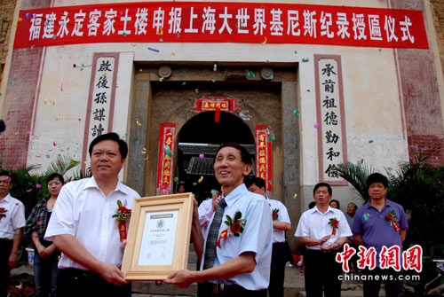 6月12日上午,上海大世界基尼斯總部在世界遺產(chǎn)永定“承啟樓”舉行授匾儀式。上海大世界基尼斯總部將“大世界基尼斯之最·擁有‘福建土樓’最多的縣——福建省永定縣”的匾牌授予永定縣,標(biāo)志著永定客家土樓成為基尼斯記錄中的重要一員。 匾牌上銹刻著:該縣現(xiàn)存“福建土樓”23000座,遍布各個(gè)鄉(xiāng)鎮(zhèn)、村落,其中圈數(shù)最多、建筑規(guī)模最大的為“承啟樓”;最高的為“永隆昌樓”;最古老的為“龍安寨”(始建于唐朝)。 劉永良 攝