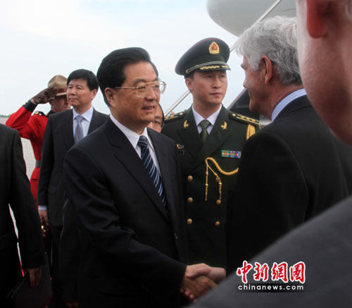經(jīng)過13個(gè)多小時(shí)、跨越東西半球的長(zhǎng)途飛行,中國(guó)國(guó)家主席胡錦濤乘坐的專機(jī)當(dāng)?shù)貢r(shí)間23日傍晚6時(shí)許平穩(wěn)降落在渥太華國(guó)際機(jī)場(chǎng)。這是近5年來(lái),胡錦濤再次對(duì)加拿大進(jìn)行國(guó)事訪問。