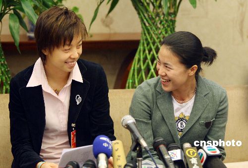 十月十七日,中共十七大代表、乒乓球運(yùn)動(dòng)員王楠、張怡寧在北京梅地亞中心接受中外媒體采訪。當(dāng)有記者問及訓(xùn)練以外的生活細(xì)節(jié)時(shí),二人相視而笑。中新社發(fā) 毛建軍 攝