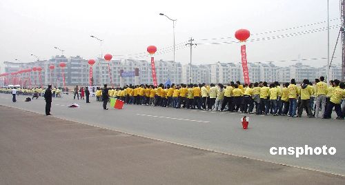 1月6日上午,湖南歷史上規(guī)模最大的拔河比賽在長沙瀟湘大道舉行,共有3000多人參加,分成“新岳麓”隊和“新河西”隊。比賽用繩長1008米,最粗處直徑0.1米,重達3噸,外層是白色的高強度聚丙烯纖維,里面的黑色材質(zhì)采用的是赫赫有名的“凱夫拉”纖維。最終,“新河西”隊獲勝。中新社發(fā) 肖前輝 攝