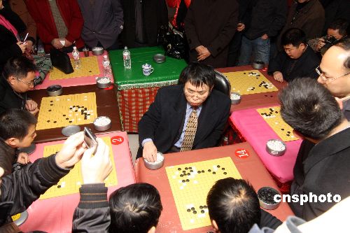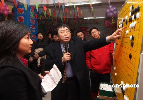 1月15日,聶衛(wèi)平在湖南漣源市與5位棋手展開車輪大戰(zhàn)。當日,聶衛(wèi)平與漣源市迎奧運首屆“九龍杯圍棋大獎賽”冠軍胡軍民、亞軍潘勇、劉小希等5位棋手展開車輪大戰(zhàn)。聶衛(wèi)平分別讓給他們2-4個子,經(jīng)過2個多小時的決戰(zhàn),聶衛(wèi)平“輸”給胡軍民、潘勇、劉小希3人,贏取另2人。賽后聶衛(wèi)平為婁底市百多名棋手講解精彩圍棋。中新社發(fā) 郭國權(quán) 攝