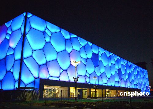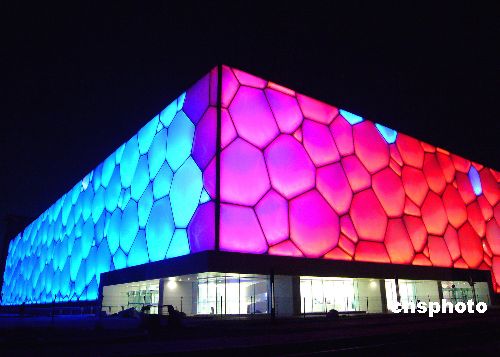 2008年1月23日晚,經(jīng)過清洗的“水立方”外膜透光度明顯增加,在藍(lán)色主燈光的照射下更加晶瑩剔透,其間閃爍變幻的紅、黃、綠燈光組合也更加鮮艷奪目,呈現(xiàn)出色彩斑斕如詩如畫的夢幻佳境。中新社發(fā) 玉龍 攝