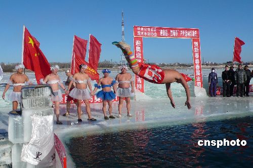 1月27日,黑河市冬泳俱樂部、俄羅斯遠(yuǎn)東冬泳俱樂部聯(lián)合在黑龍江畔舉辦“迎奧運(yùn),賀新春、強(qiáng)體魄、促和諧”為主題的系列體育競賽活動。當(dāng)日,黑河冬泳俱樂部的隊(duì)員們身著自制的芭蕾服裝偏偏起舞,他們還和俄羅斯遠(yuǎn)東冬泳俱樂部共計(jì)200余名隊(duì)員,先后進(jìn)行了“與奧運(yùn)同行”沿黑龍江江堤徒步宣傳活動、雪地足球?qū)官、冬泳表演等系列體育競賽活動,表達(dá)了邊城健兒們向往2008奧運(yùn)會的共同愿望和對全國人民新春佳節(jié)美好祝福。據(jù)悉,參加本次活動最大年齡的隊(duì)員為75歲。中新社發(fā) 邱齊龍 攝