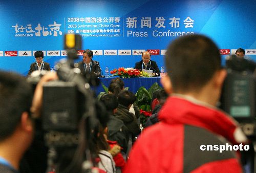 1月29日,在“水立方”召開的中國游泳公開賽新聞發(fā)布會(huì),吸引各國媒體爭(zhēng)相報(bào)道。中國游泳公開賽是在國家游泳中心——水立方舉行的首場(chǎng)比賽。中新社發(fā) 富田 攝