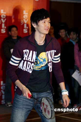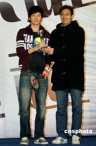 1月29日,北京某品牌服飾請來潮流天王陳冠希及內(nèi)地知名設(shè)計師樊小博分別設(shè)計限量Sports概念Tee。在發(fā)布會現(xiàn)場,主辦方特別邀請了2008年奧運金牌有力競爭者——羽毛球國手鮑春來出席宣傳活動。中新社發(fā) 袁方 攝