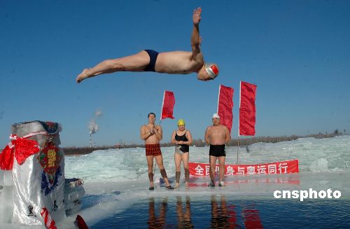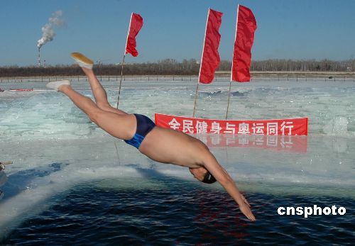 2月7日,黑龍江黑河市冬泳俱樂(lè)部與俄羅斯布拉戈維申斯克市冬泳俱樂(lè)部的30多名隊(duì)員,在黑河市中俄界江冒著零下30度的嚴(yán)寒,以冬泳方式歡度新春佳節(jié)。中新社發(fā) 邱齊龍 攝
