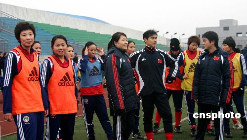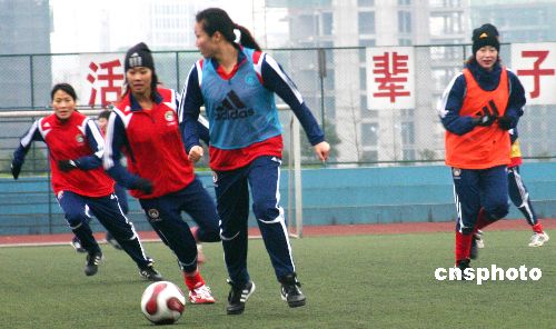 2月9日,中國女子足球隊(duì)的教練員、隊(duì)醫(yī)、管理、新聞官、理療師、裝備經(jīng)理、運(yùn)動員等40多名人員分別從北京、沈陽、成都等地飛抵重慶后,陸續(xù)到達(dá)2008東亞女足錦標(biāo)賽的比賽地——永川區(qū)。當(dāng)日下午4時(shí),韓端、徐媛、李潔等先期到永川的19名運(yùn)動員在主教練伊麗莎白的帶領(lǐng)下,來到重慶文理學(xué)院足球場進(jìn)行常規(guī)訓(xùn)練。中新社發(fā) 陳仕川 攝