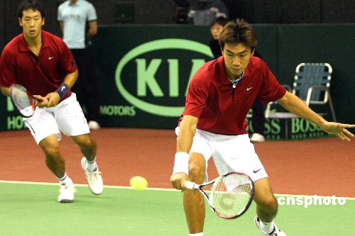 2月9日,2008年戴維斯杯亞大區(qū)II組中國隊vs黎巴嫩隊比賽在北京國際網(wǎng)球中心進行了第三場雙打比賽的較量。于欣源/曾少昡 以6:2,7:6(4),6:2戰(zhàn)勝黎巴嫩的吉桑·扎阿蒂尼/帕蒂克·楚克里雙打組合。盡管后兩場單打還沒進行,中國隊總比分3:0已經(jīng)確保勝利晉級下輪。中新社發(fā) 富田 攝