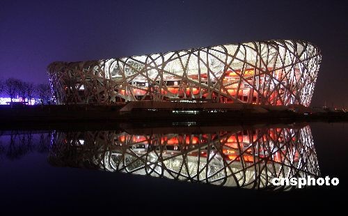 圖:國家體育場“鳥巢”進行全面試燈