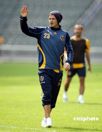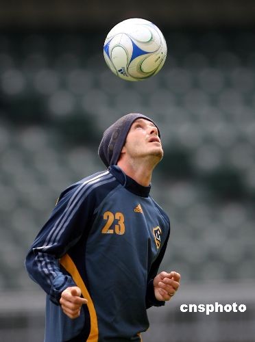 三月八日,英國(guó)足球巨星、現(xiàn)效力于美國(guó)洛杉磯銀河隊(duì)的貝克漢姆在香港大球場(chǎng)與球隊(duì)一起訓(xùn)練,備戰(zhàn)九日將舉行的表演賽。中新社發(fā) 武仲林 攝