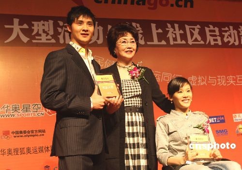 3月27日,前著名運(yùn)動(dòng)員田亮(左)和桑蘭,從中國奧委會(huì)副主席何慧嫻(中)手中接過“加油中國”形象大使證書。當(dāng)日,由中國最大的垂直體育門戶網(wǎng)站華奧星空主辦的“加油中國”大型活動(dòng)與線上社區(qū)啟動(dòng)儀式,在北京舉行。中新社發(fā) 趙振清 攝