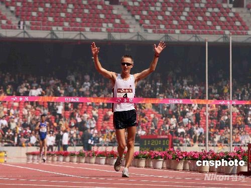 4月18日,國(guó)家體育場(chǎng)“鳥巢”迎來首場(chǎng)賽事,“好運(yùn)北京”2008國(guó)際田聯(lián)競(jìng)走挑戰(zhàn)賽在此打響。在男子20公里競(jìng)走比賽中,澳大利亞選手塔倫特以1小時(shí)20分11秒的成績(jī)摘得了“鳥巢”建成以來的首枚金牌。中新社發(fā) 富田 攝