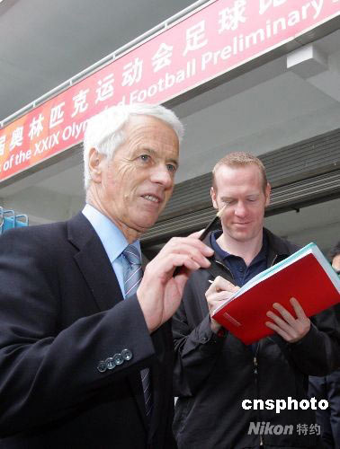 4月22日,國際足聯(lián)考察團(tuán)一行在北京奧組委官員的陪同下抵達(dá)上海,對(duì)08奧運(yùn)足球上海賽區(qū)籌備工作進(jìn)行考察。圖為國際足聯(lián)競賽部官員瓦特·西伯(左)和約翰·舒馬赫在上?疾鞀W運(yùn)足球賽場(chǎng)。中新社發(fā) 湯彥俊 攝