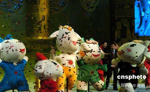 二十八日晚,廣州亞運會吉祥物在白云國際會展中心發(fā)布。吉祥物取名“樂羊羊”,形象是運動時尚的五只羊,分別取名“阿祥”、“阿和”、“阿如”、“阿意”、“樂羊羊”,組成“祥和如意樂洋洋”,表達了廣州亞運會將給亞洲人民帶來“吉祥、和諧、幸福、圓滿和快樂”的美好祝愿,同時也傳達該屆運動會“和諧、激情”的理念。中新社發(fā) 柯小軍 攝