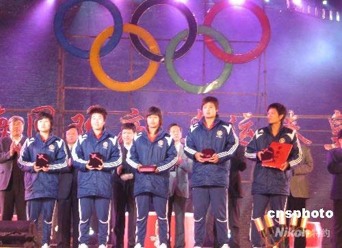 4月29日晚,“山海同歡慶·奧運秦皇島”迎奧運倒計時一百天大型慶;顒樱凇疤煜碌谝魂P”山海關廣場舉行,中國女足被秦皇島市授予榮譽市民。中新社發(fā) 潘海濤 攝