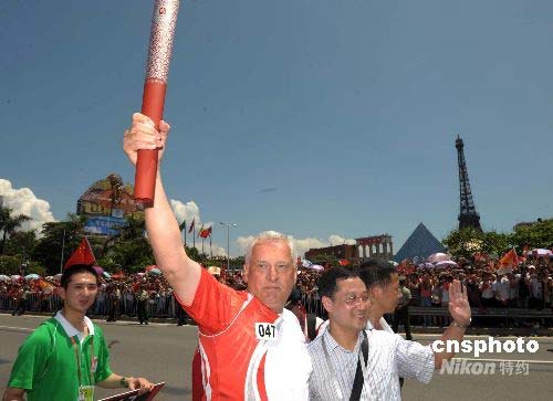 5月8日,奧運圣火在深圳進行傳遞。在深圳世界之窗門前芬蘭籍火炬手芬蘭前奧委會主任塔帕尼·愛爾卡同深圳市民同樂祥云火炬。中新社發(fā) 廖攀 攝