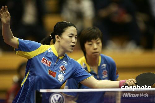 5月15日,在長春舉行的2008年國際乒聯(lián)巡回賽中國乒乓球公開賽進(jìn)入第二天的比賽,在女子團(tuán)體比賽中,王楠、張怡寧組合3比1戰(zhàn)勝日本福原愛、福岡春菜組合。中新社發(fā) 杜洋 攝