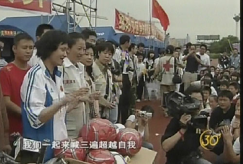 奧運(yùn)冠軍與災(zāi)區(qū)孩子一起高呼超越自我