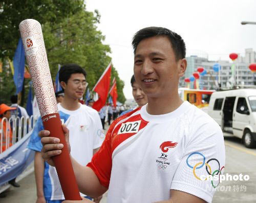 5月28日上午8時,北京奧運會火炬接力安徽的傳遞活動在合肥拉開帷幕。剛從四川災區(qū)抗震回來的合肥市特警支隊的火炬手周世軍正在進行火炬?zhèn)鬟f。中新社發(fā) 張婭子 攝