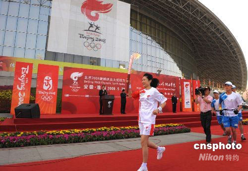 5月29日,奧運(yùn)圣火在安徽淮南傳遞,中央電視臺(tái)主持人周濤領(lǐng)跑第一棒火炬。目前,周濤承擔(dān)北京奧運(yùn)會(huì)和殘奧會(huì)全球電視轉(zhuǎn)播總協(xié)調(diào)工作。中新社發(fā) 廖攀 攝