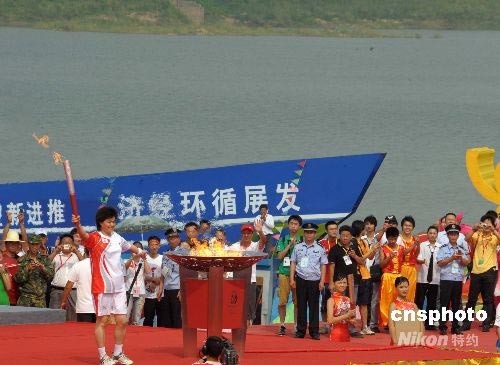 6月3日,湖南省副省長甘霖作為當?shù)刈詈笠话艋鹁媸贮c燃位于汨羅江畔的圣火盆,標志著奧運圣火岳陽站傳遞結束。 中新社發(fā) 廖攀 攝