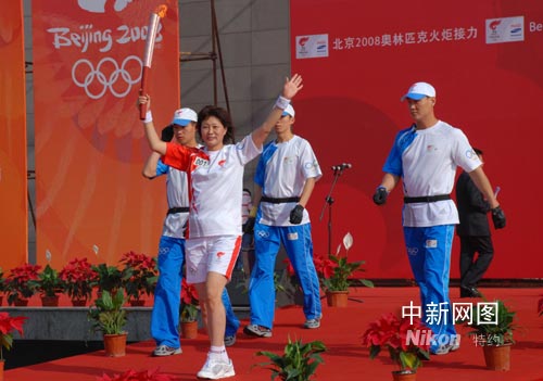 6月25日上午,奧運(yùn)火炬在山西運(yùn)城傳遞,8時15分山西第一棒火炬手,1984年洛杉磯奧運(yùn)會女子手球比賽團(tuán)體銅牌得主張衛(wèi)紅接過點燃的火炬開始傳遞。張雷杰 攝