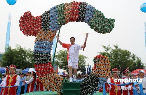 7月10日,奧運(yùn)火炬在內(nèi)蒙古赤峰市進(jìn)行傳遞;鹁媸钟诮ㄔO(shè)穿過用福娃組成的“玉龍”。在赤峰翁牛特旗出土的紅山文化標(biāo)志性文物——玉龍,被史學(xué)界定為“中華第一龍”。中新社發(fā) 廖攀 攝