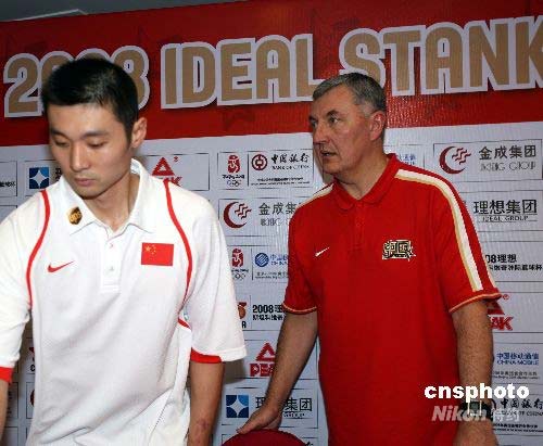 7月16日,到杭州參加2008斯坦科維奇洲際杯籃球賽的中國男籃主教練尤納斯與主力后衛(wèi)劉煒在出席新聞發(fā)布會(huì)時(shí)向媒體透露,傷愈的姚明肯定將在比賽中上場(chǎng)。但是尤納斯對(duì)中國男籃在北京奧運(yùn)會(huì)的前景三緘其口。中新社發(fā) 任晨鳴 攝
