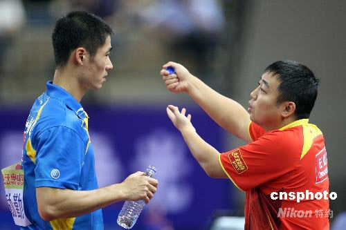 7月29日,中國乒乓球隊(duì)備戰(zhàn)奧運(yùn)熱身賽在無錫繼續(xù)進(jìn)行,男隊(duì)針對(duì)非奧運(yùn)選手制定獎(jiǎng)勵(lì)機(jī)制,在以王皓、馬琳、王勵(lì)勤3人為擂主的擂臺(tái)賽上,每名非奧運(yùn)選手獲得一場(chǎng)勝利,就將獲得2009年一項(xiàng)國際公開賽的參賽權(quán);獲得兩場(chǎng)勝利就能獲得2009年世乒賽單項(xiàng)比賽的參賽資格;獲得三場(chǎng)勝利則可以直接獲得2009年世乒賽男單比賽的參賽資格。擂主王勵(lì)勤在比賽中苦戰(zhàn)7局最終4比3完成大逆轉(zhuǎn)戰(zhàn)勝小將徐輝,主教練劉國梁賽中緊急指導(dǎo)。中新社發(fā) 盛佳鵬 攝
