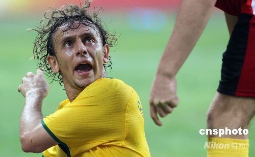8月7日,北京奧運(yùn)沈陽足球分賽場舉行男足預(yù)賽,巴西隊1:0勝比利時隊。圖為巴西球員RAFINHA怒對比利時犯規(guī)球員。中新社發(fā) 張宇 攝