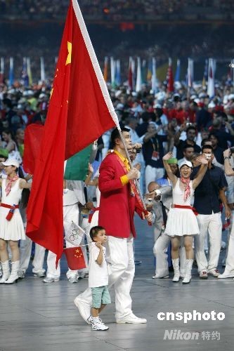 8月8日,第29屆夏季奧運會在北京奧林匹克公園內(nèi)的國家體育場“鳥巢”舉行。中國代表團的旗手是著名籃球運動員姚明,走在姚明身邊的是獲得英雄少年的光榮稱號的四川省阿壩州映秀鎮(zhèn)漁子溪小學(xué)二年級學(xué)生林浩。中國體育代表團派出了1099人的龐大陣容,將參加全部28個大項的比賽。中新社發(fā) 杜洋 攝