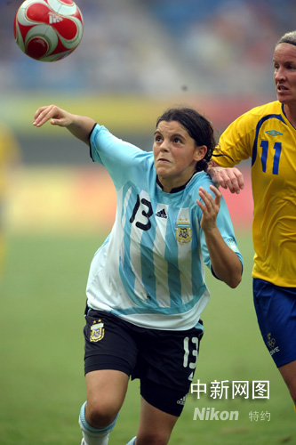 8月9日,奧運阿根廷女足在天津奧體中心水滴體育場對陣瑞典隊。圖為阿根廷女足13號隊員瑪麗亞·奎諾尼斯在進攻。中新社記者 陳文 攝