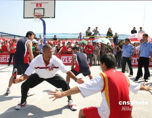 9月1日上午,參加“08中國愛心之旅”的NBA火箭隊球星巴蒂爾,來到四川地震極重災區(qū)都江堰市勤儉人家災民安置點慰問災區(qū)民眾。中新社發(fā) 霍潺 攝