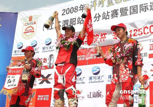 9月21日,2008年全國(guó)摩托車(chē)越野錦標(biāo)賽泗陽(yáng)站暨國(guó)際越野摩托車(chē)邀請(qǐng)賽在江蘇泗陽(yáng)結(jié)束,來(lái)自香港國(guó)際精英隊(duì)的賴(lài)智豐獲得國(guó)內(nèi)專(zhuān)業(yè)125cc組冠軍,云南紅河隊(duì)的師羽萌、劉浪分獲第二、三名。中新社發(fā) 趙振清 攝